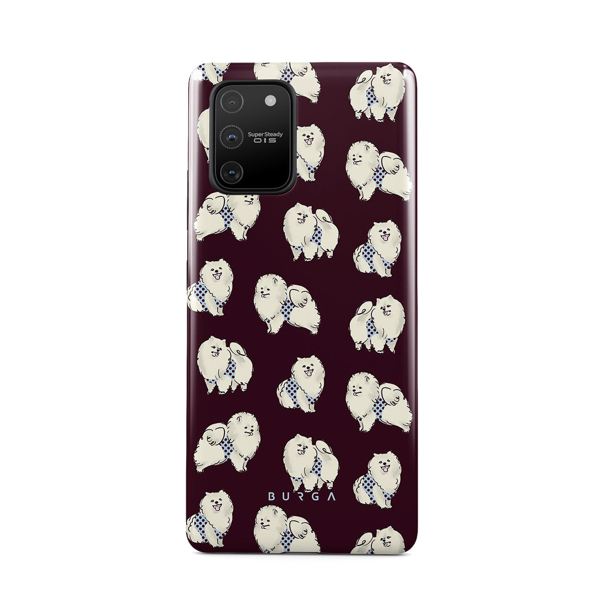 En este diseño: perros blancos y esponjosos, fondo burdeos oscuro, caniches, mascotas