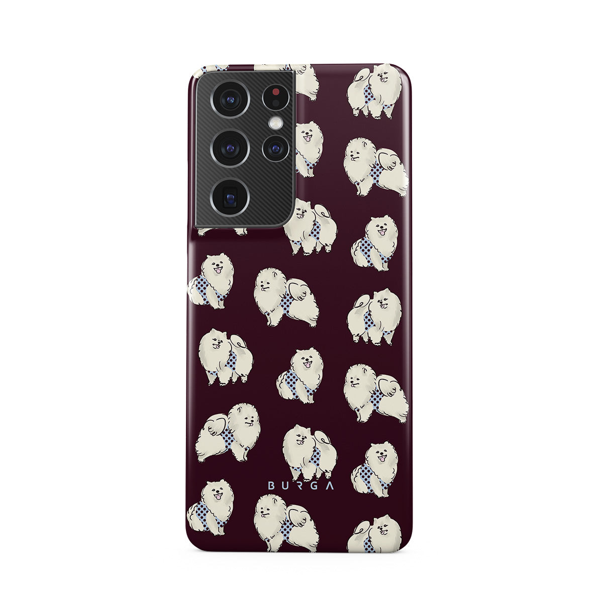 En este diseño: perros blancos y esponjosos, fondo burdeos oscuro, caniches, mascotas