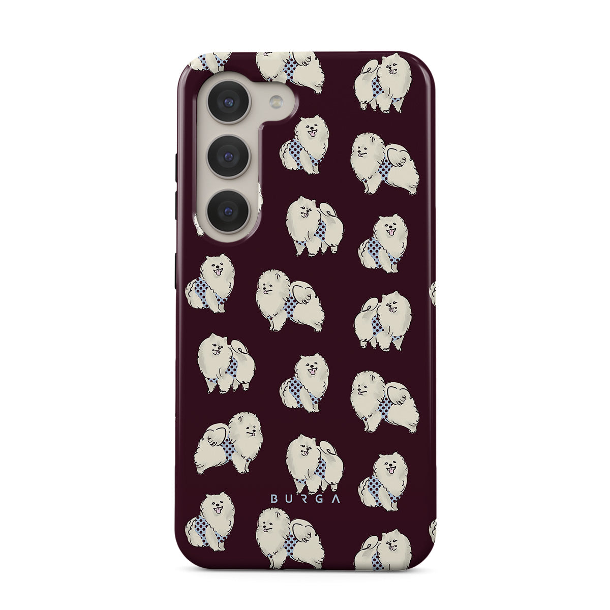 En este diseño: perros blancos y esponjosos, fondo burdeos oscuro, caniches, mascotas