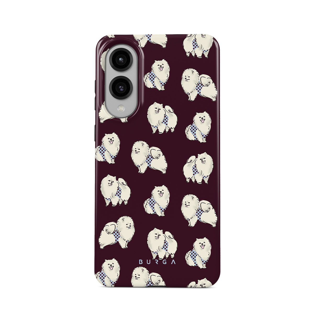 En este diseño: perros blancos y esponjosos, fondo burdeos oscuro, caniches, mascotas