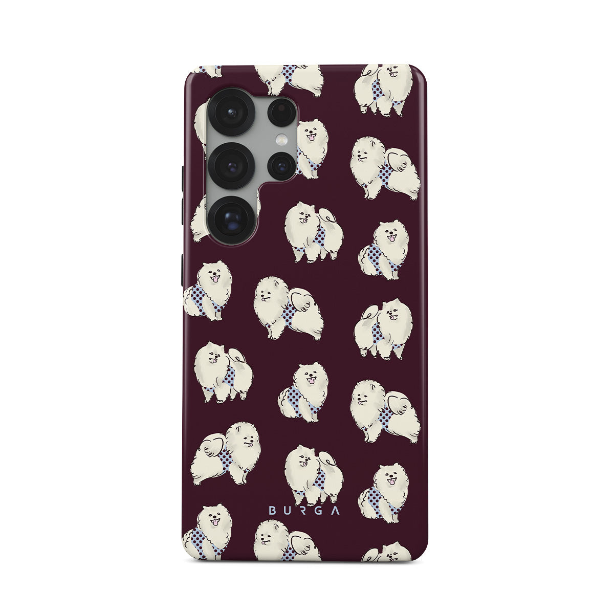En este diseño: perros blancos y esponjosos, fondo burdeos oscuro, caniches, mascotas