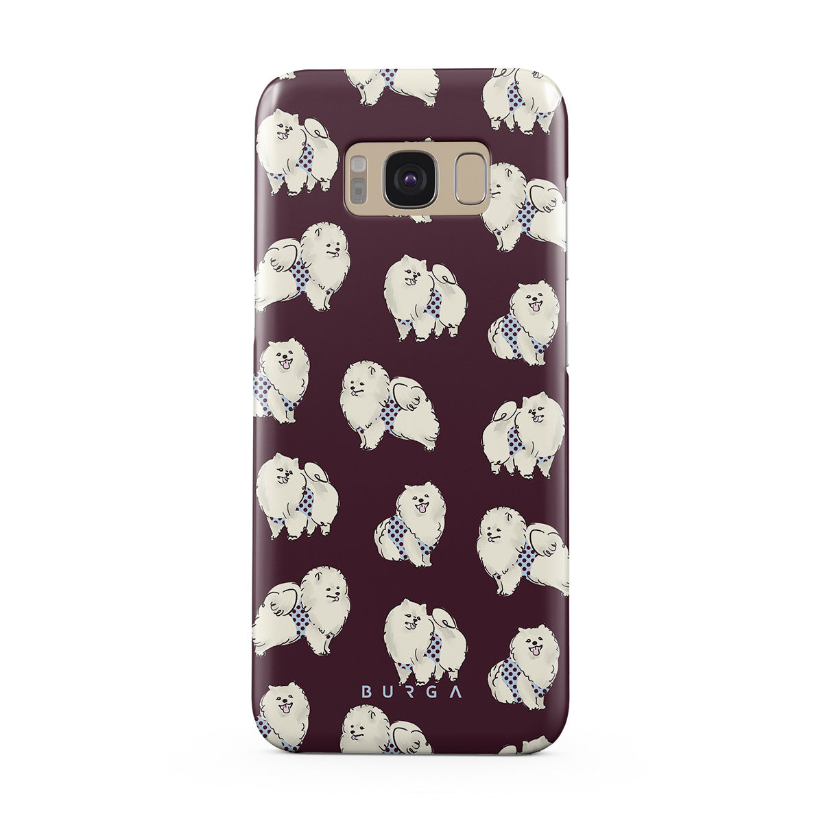 En este diseño: perros blancos y esponjosos, fondo burdeos oscuro, caniches, mascotas