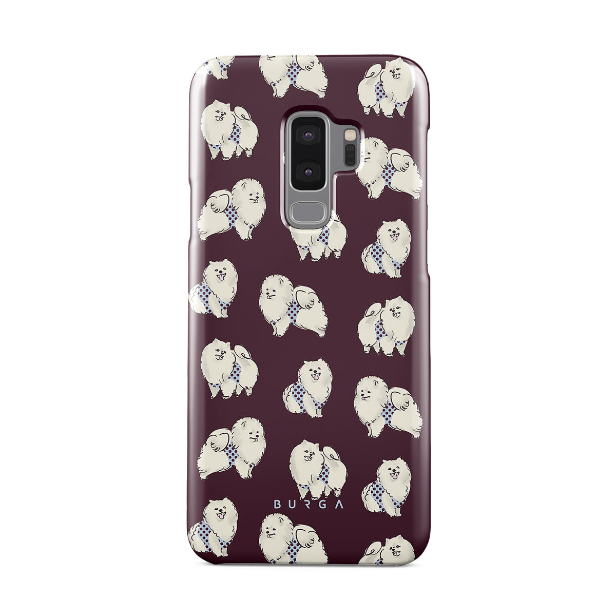 En este diseño: perros blancos y esponjosos, fondo burdeos oscuro, caniches, mascotas