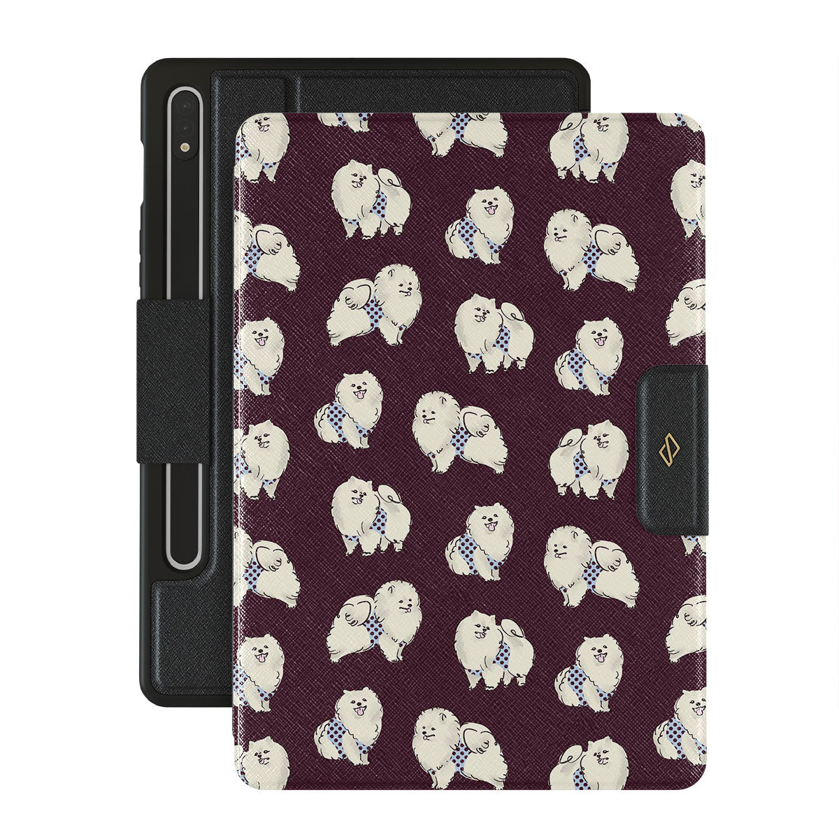 En este diseño: perros blancos y esponjosos, fondo burdeos oscuro, caniches, mascotas