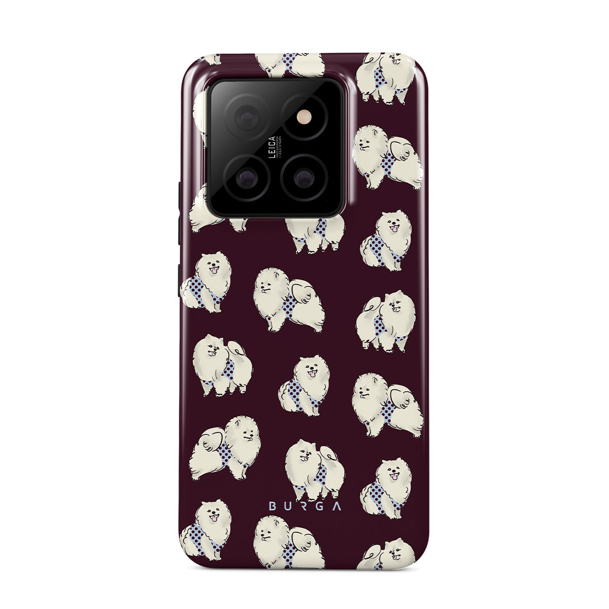 En este diseño: perros blancos y esponjosos, fondo burdeos oscuro, caniches, mascotas