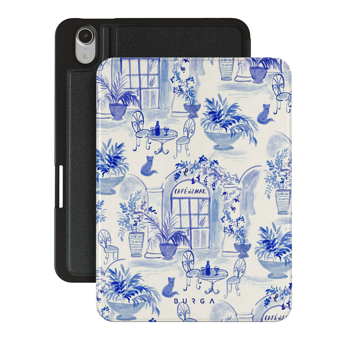 En este diseño: Tonos suaves de azul, patrones costeros, elementos de café, estilo minimalista, patrones retro, patrones mediterráneos.