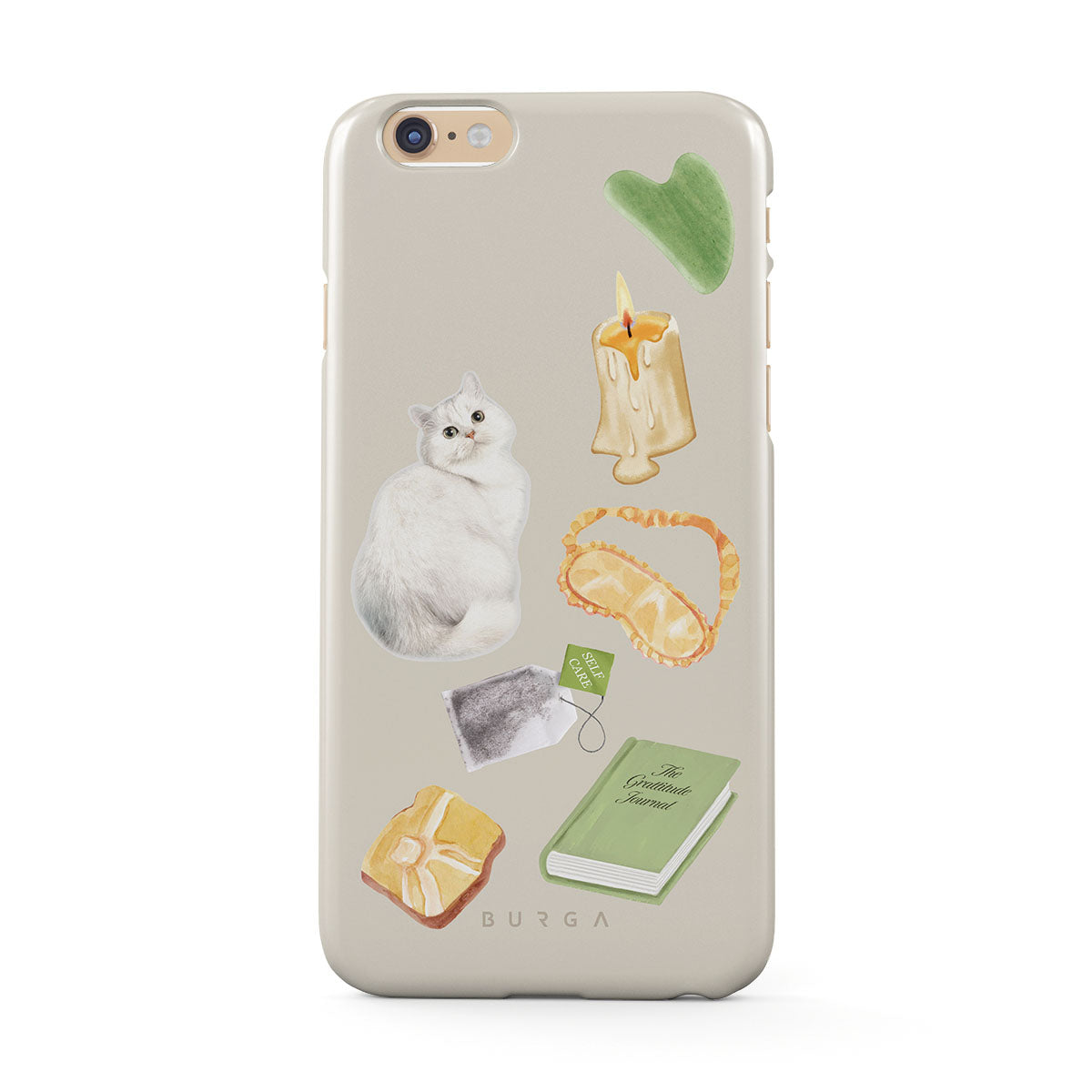 En este diseño: gato blanco, libro verde, vela, barra de Gua Sha, antifaz para dormir, bolsa de té, cristal amarillo.