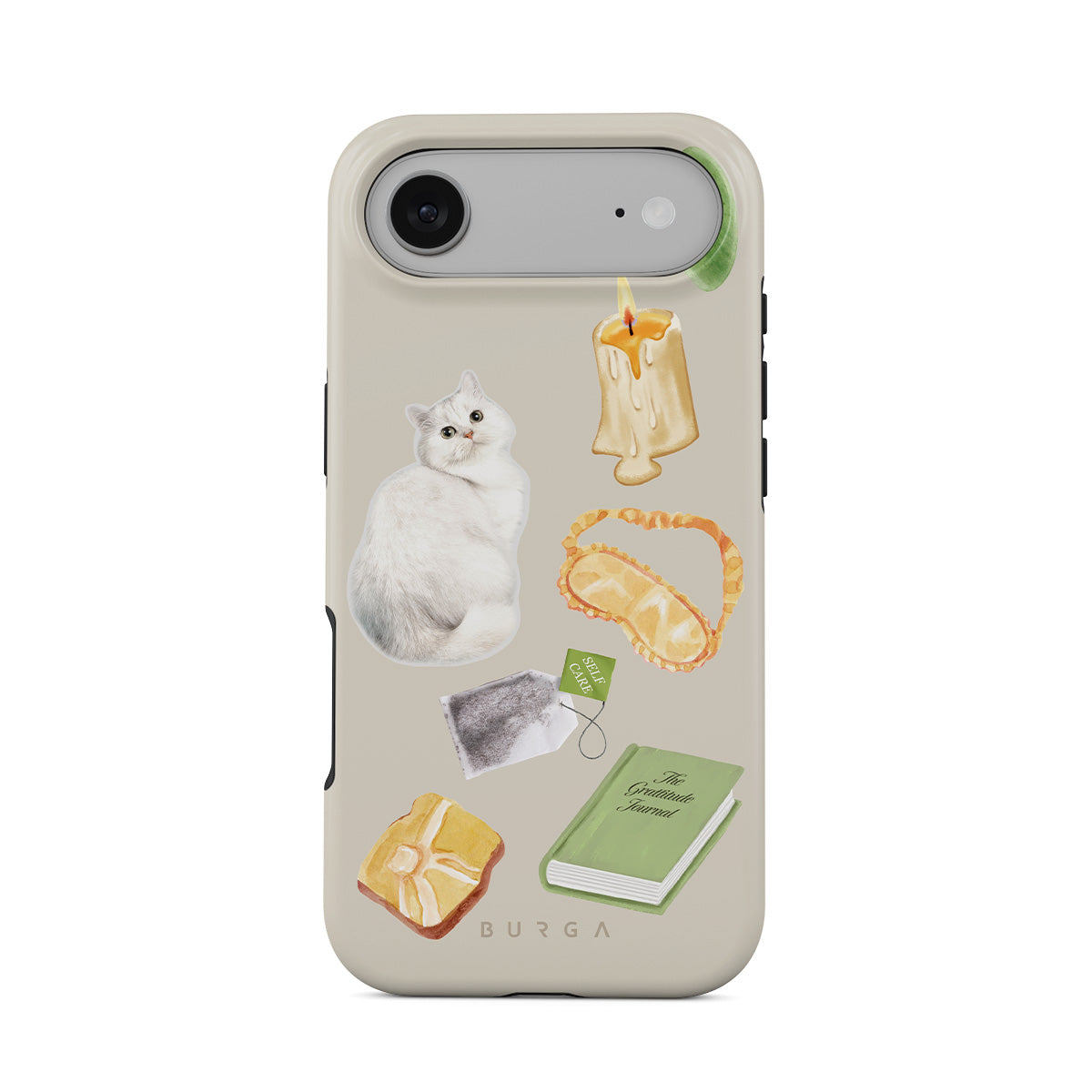 En este diseño: gato blanco, libro verde, vela, barra de Gua Sha, antifaz para dormir, bolsa de té, cristal amarillo.