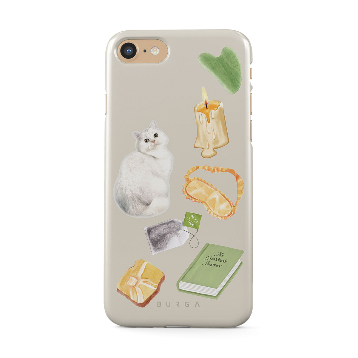 En este diseño: gato blanco, libro verde, vela, barra de Gua Sha, antifaz para dormir, bolsa de té, cristal amarillo.
