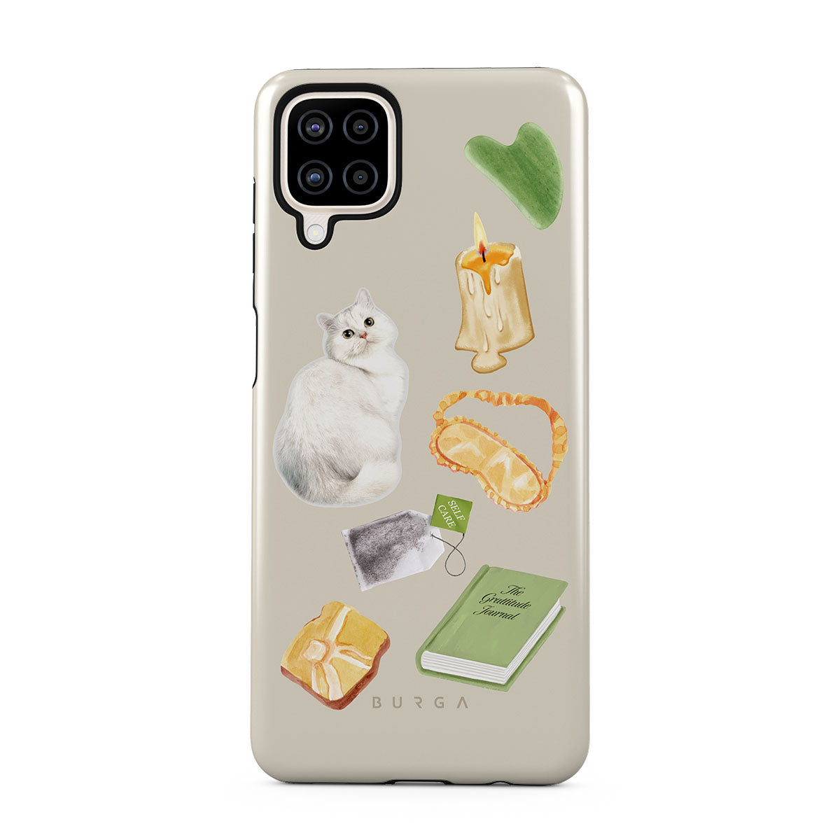 En este diseño: gato blanco, libro verde, vela, barra de Gua Sha, antifaz para dormir, bolsa de té, cristal amarillo.