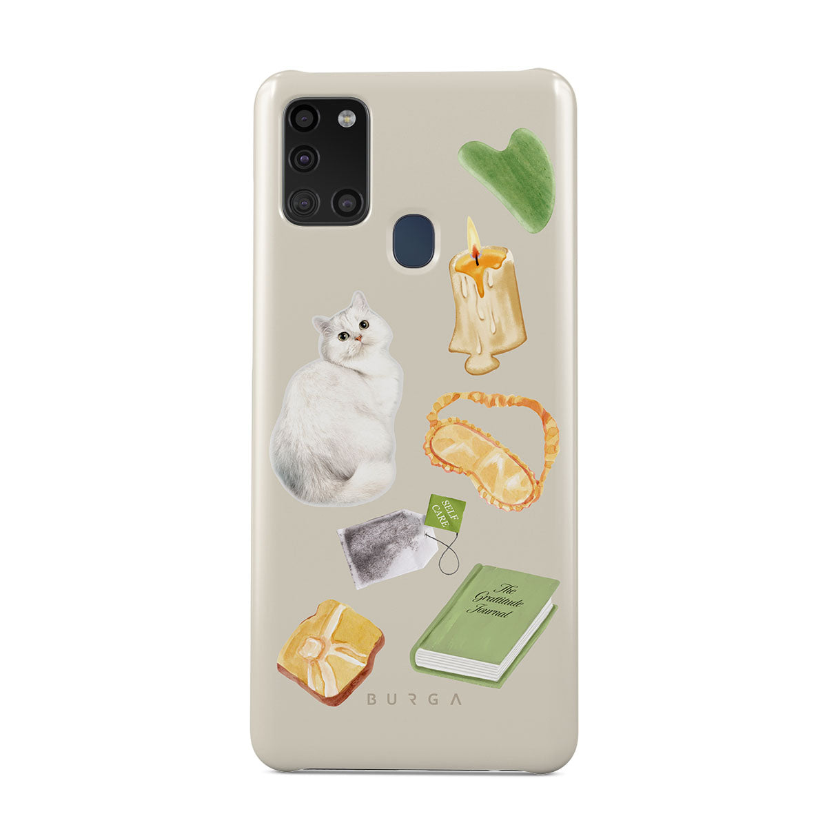 En este diseño: gato blanco, libro verde, vela, barra de Gua Sha, antifaz para dormir, bolsa de té, cristal amarillo.