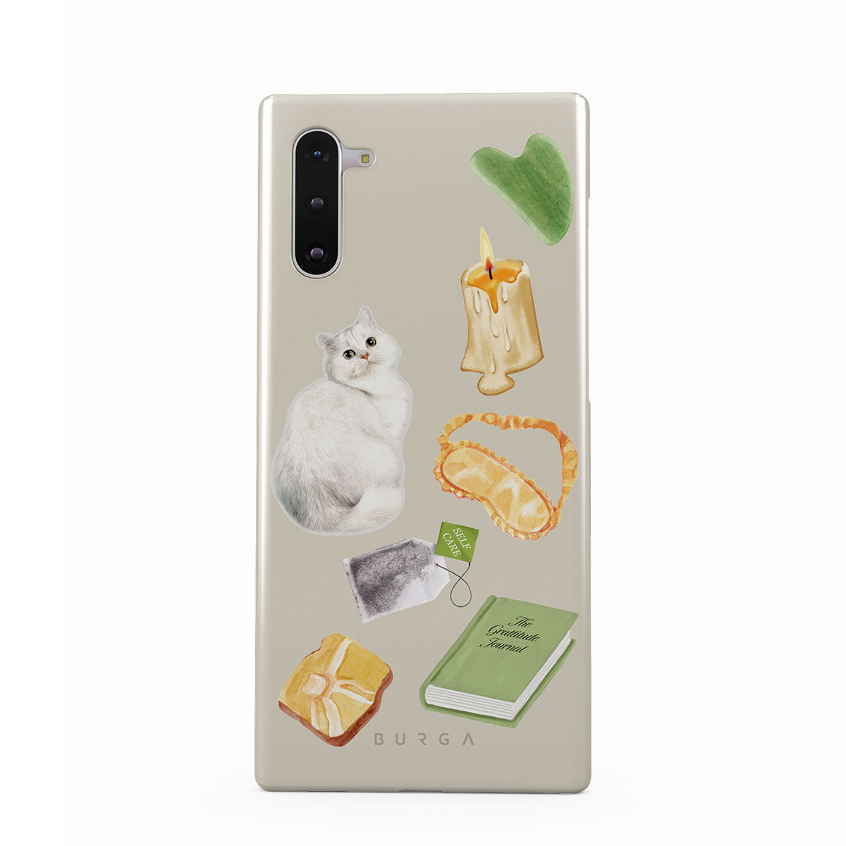 En este diseño: gato blanco, libro verde, vela, barra de Gua Sha, antifaz para dormir, bolsa de té, cristal amarillo.