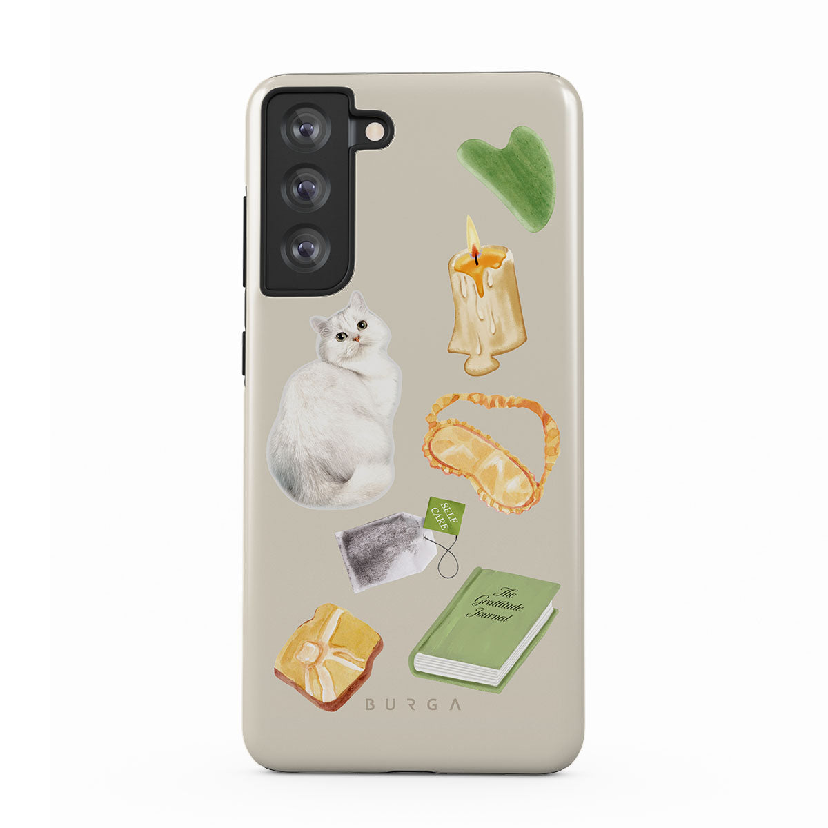 En este diseño: gato blanco, libro verde, vela, barra de Gua Sha, antifaz para dormir, bolsa de té, cristal amarillo.