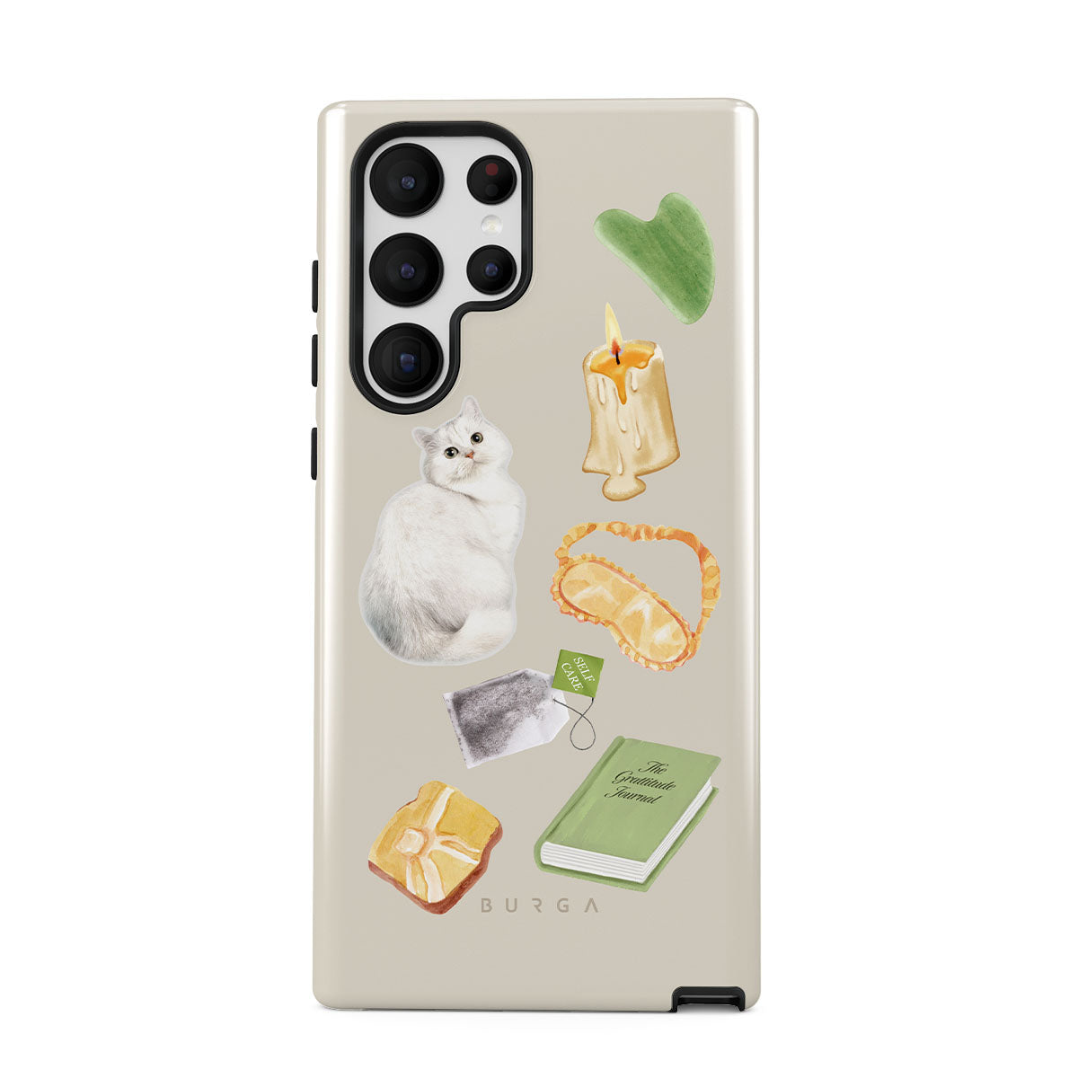 En este diseño: gato blanco, libro verde, vela, barra de Gua Sha, antifaz para dormir, bolsa de té, cristal amarillo.