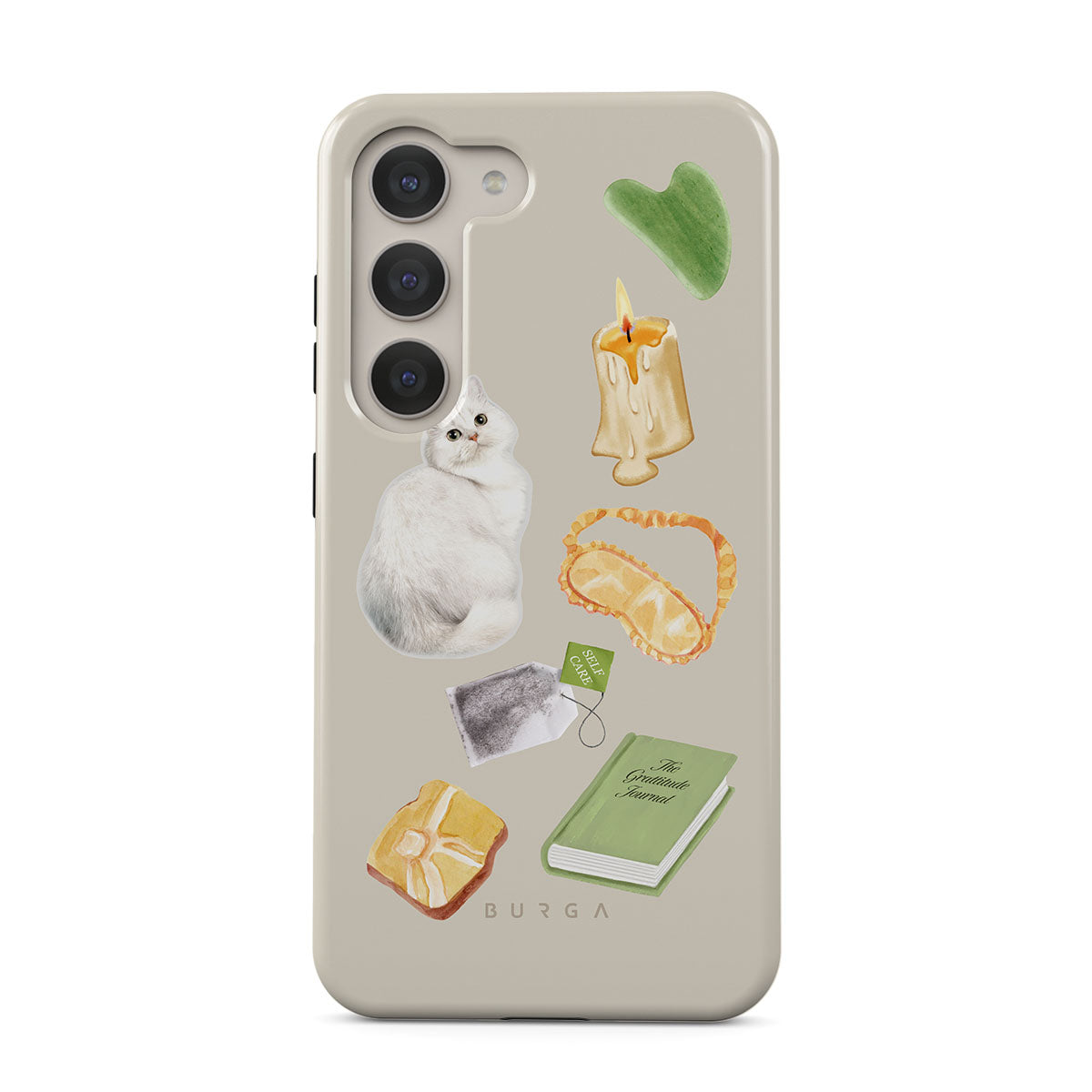 En este diseño: gato blanco, libro verde, vela, barra de Gua Sha, antifaz para dormir, bolsa de té, cristal amarillo.