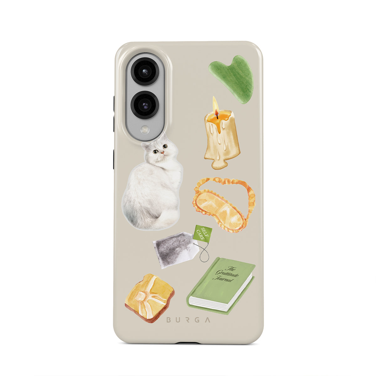 En este diseño: gato blanco, libro verde, vela, barra de Gua Sha, antifaz para dormir, bolsa de té, cristal amarillo.