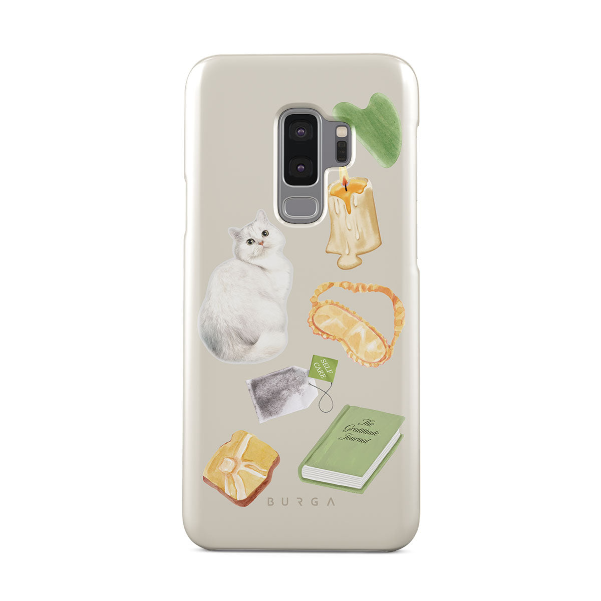 En este diseño: gato blanco, libro verde, vela, barra de Gua Sha, antifaz para dormir, bolsa de té, cristal amarillo.