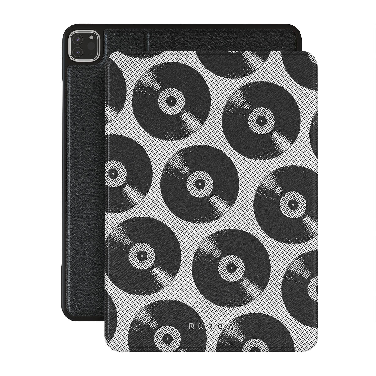 En este diseño: discos de vinilo, blanco y negro y música