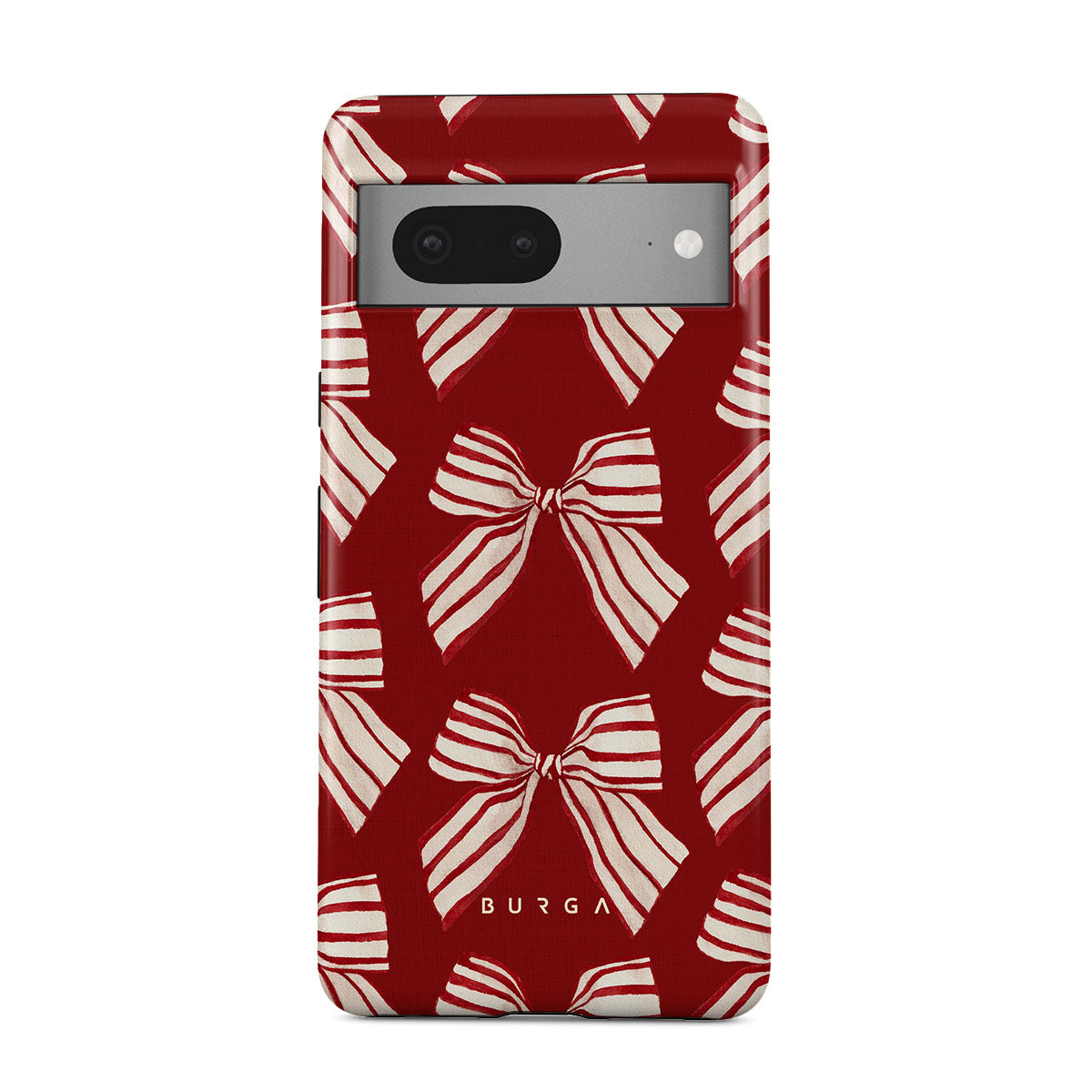 El diseño presenta: lazos, rayas, rojo, blanco, motivos navideños