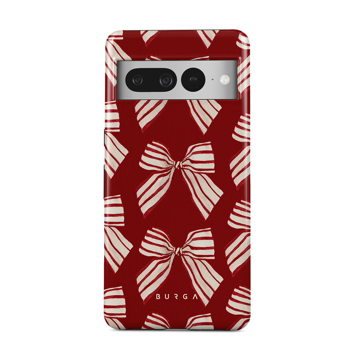 El diseño presenta: lazos, rayas, rojo, blanco, motivos navideños