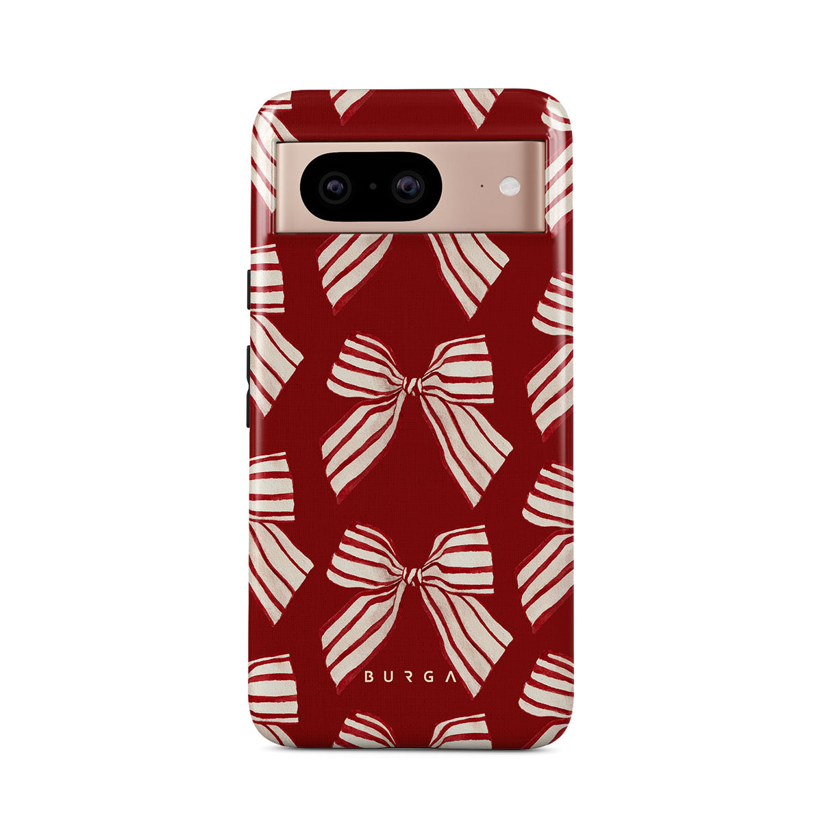 El diseño presenta: lazos, rayas, rojo, blanco, motivos navideños