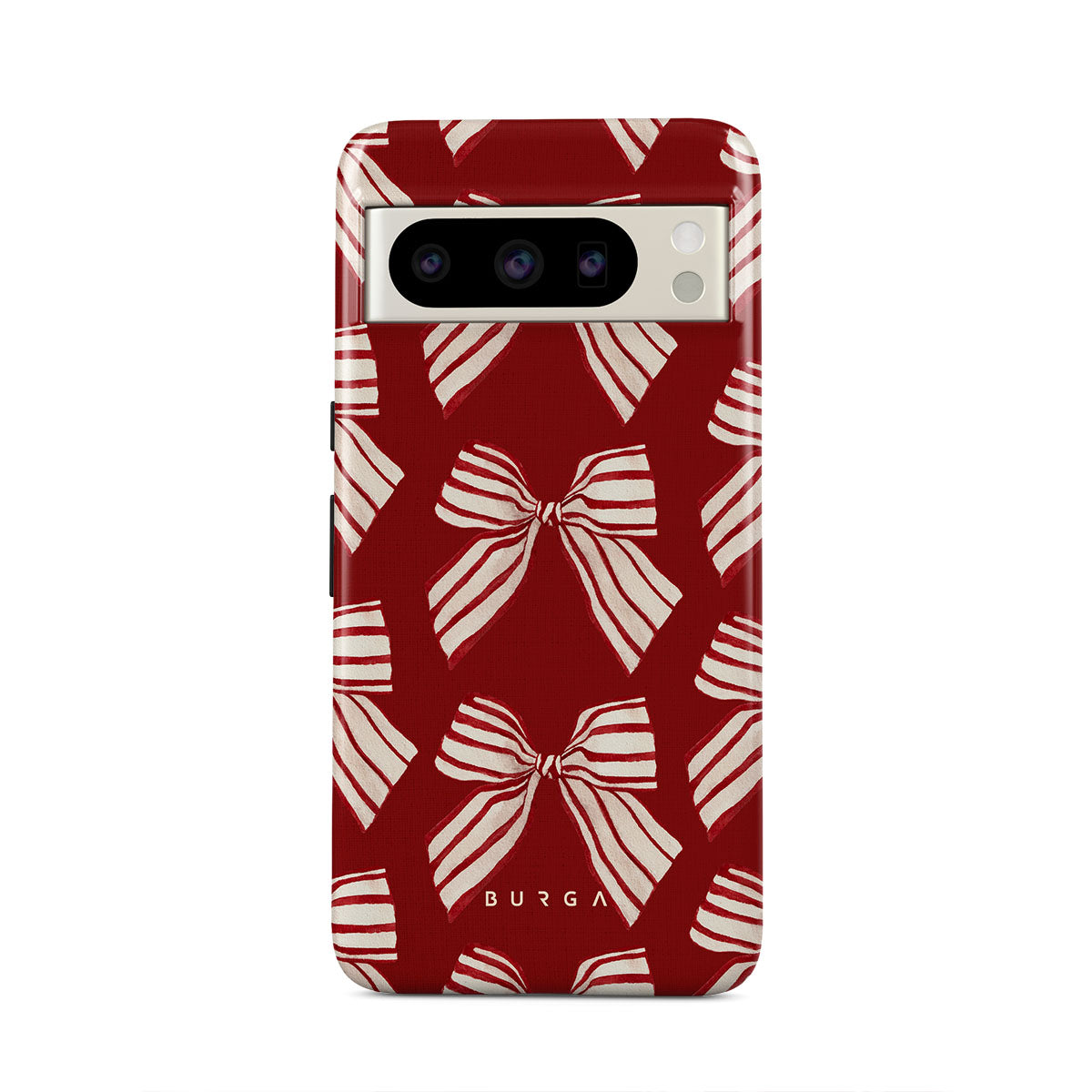 El diseño presenta: lazos, rayas, rojo, blanco, motivos navideños