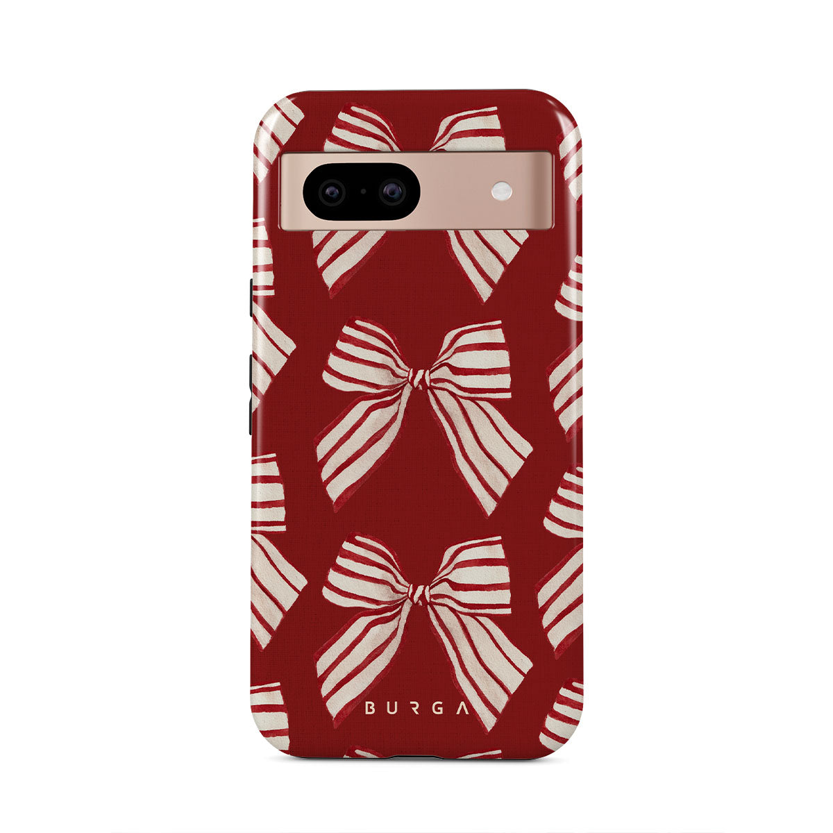 El diseño presenta: lazos, rayas, rojo, blanco, motivos navideños