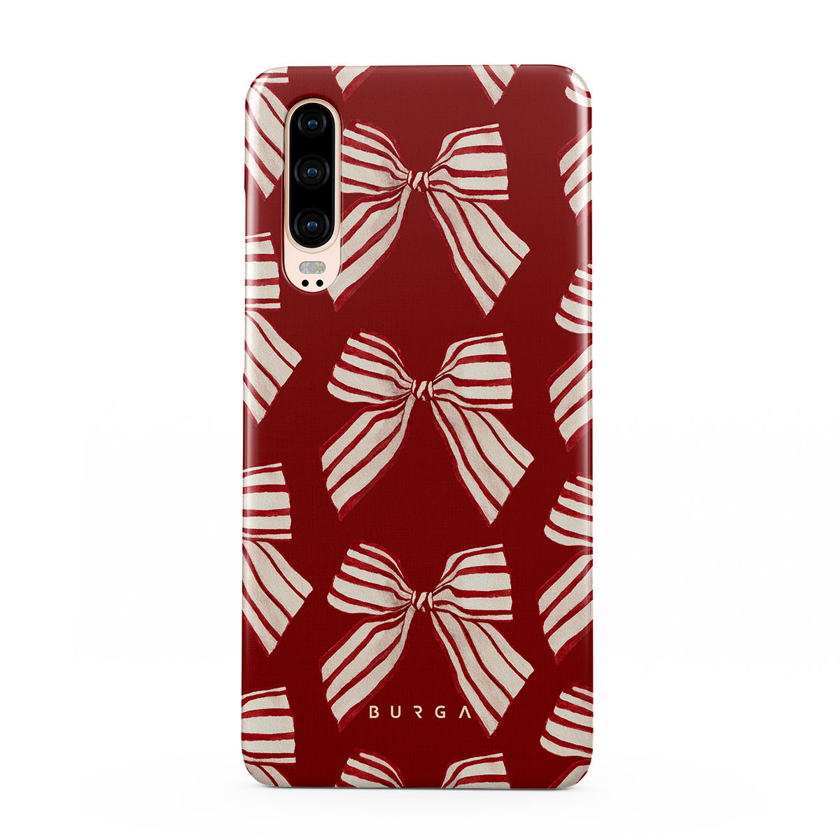 El diseño presenta: lazos, rayas, rojo, blanco, motivos navideños