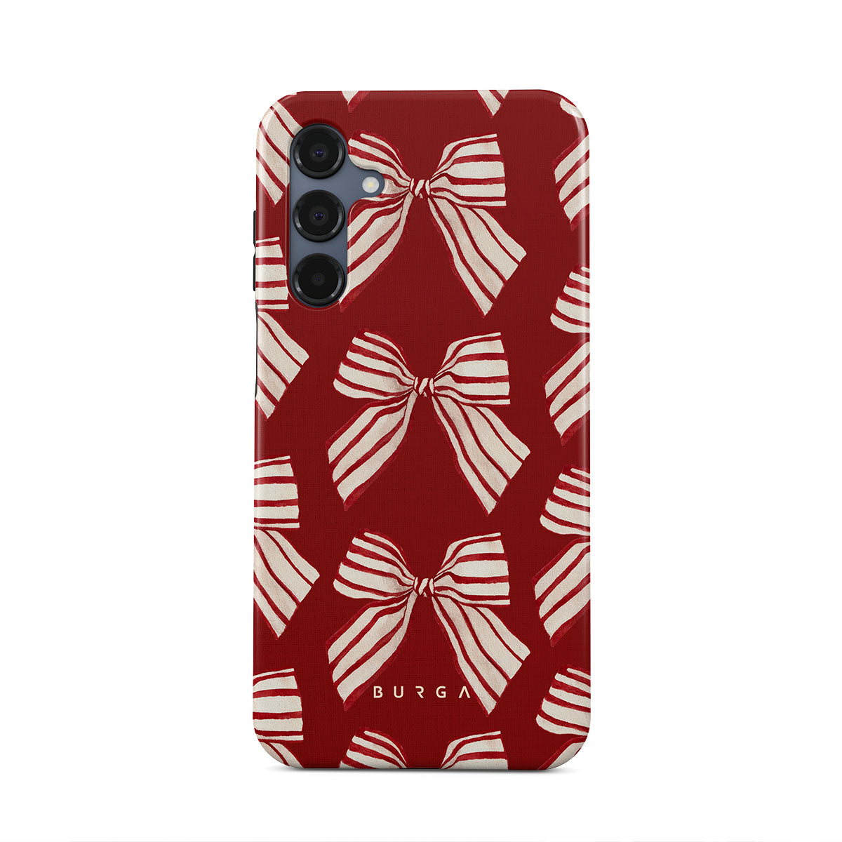 El diseño presenta: lazos, rayas, rojo, blanco, motivos navideños