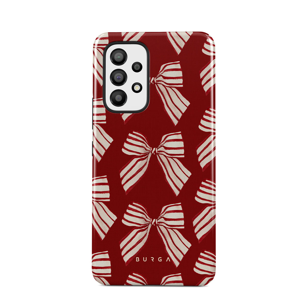 El diseño presenta: lazos, rayas, rojo, blanco, motivos navideños
