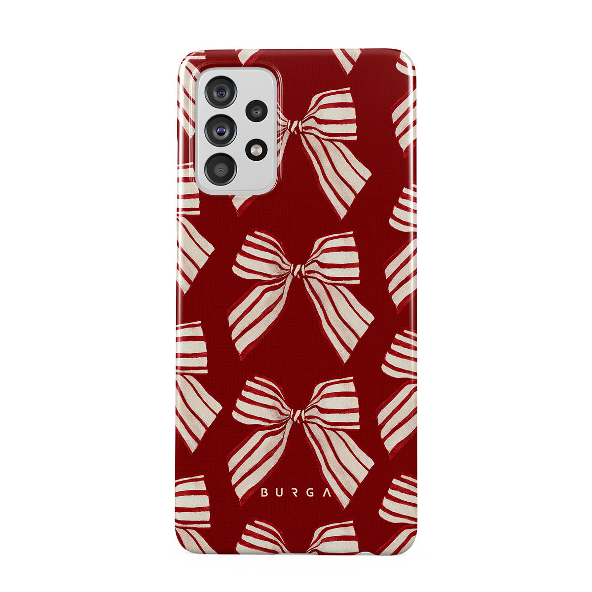 El diseño presenta: lazos, rayas, rojo, blanco, motivos navideños