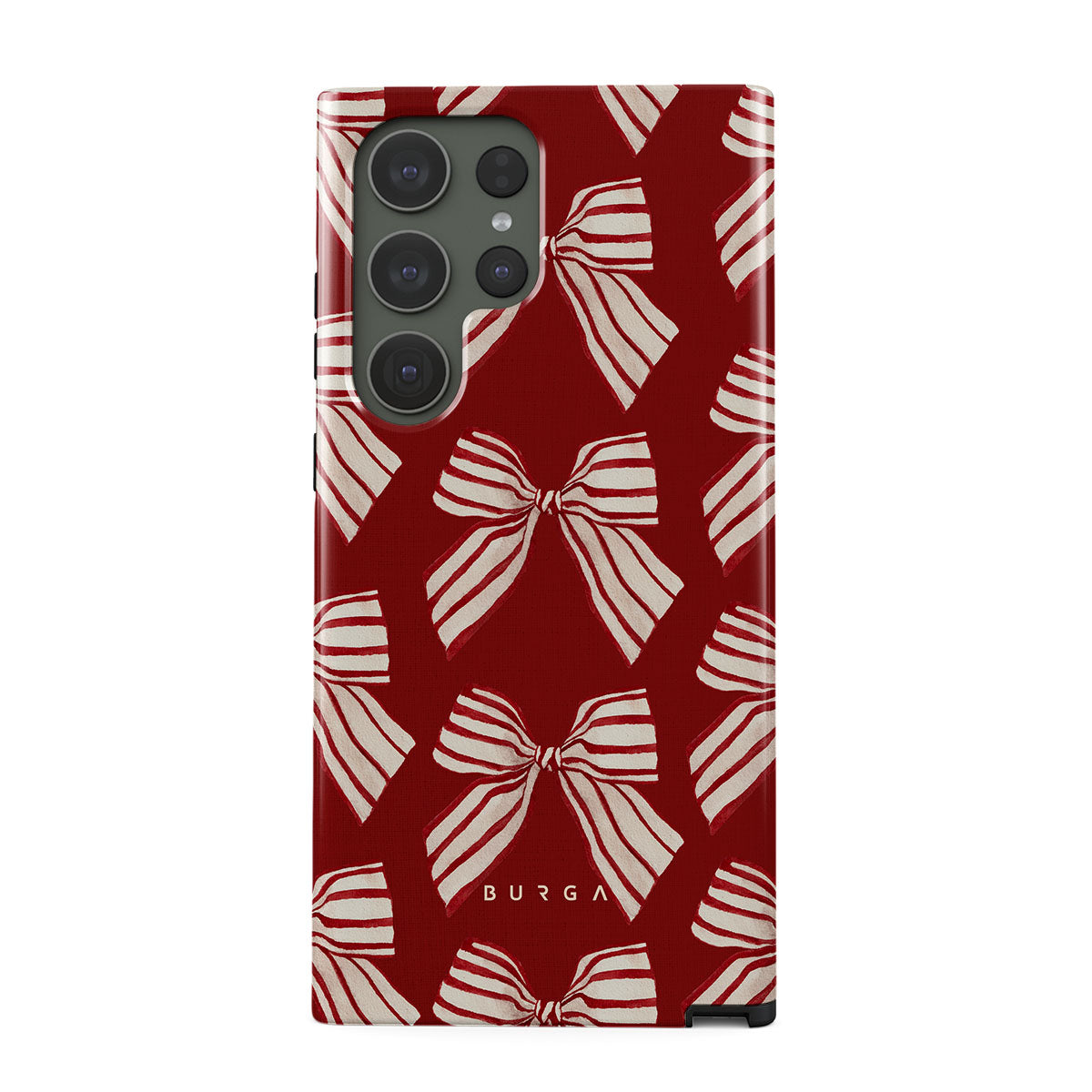 El diseño presenta: lazos, rayas, rojo, blanco, motivos navideños