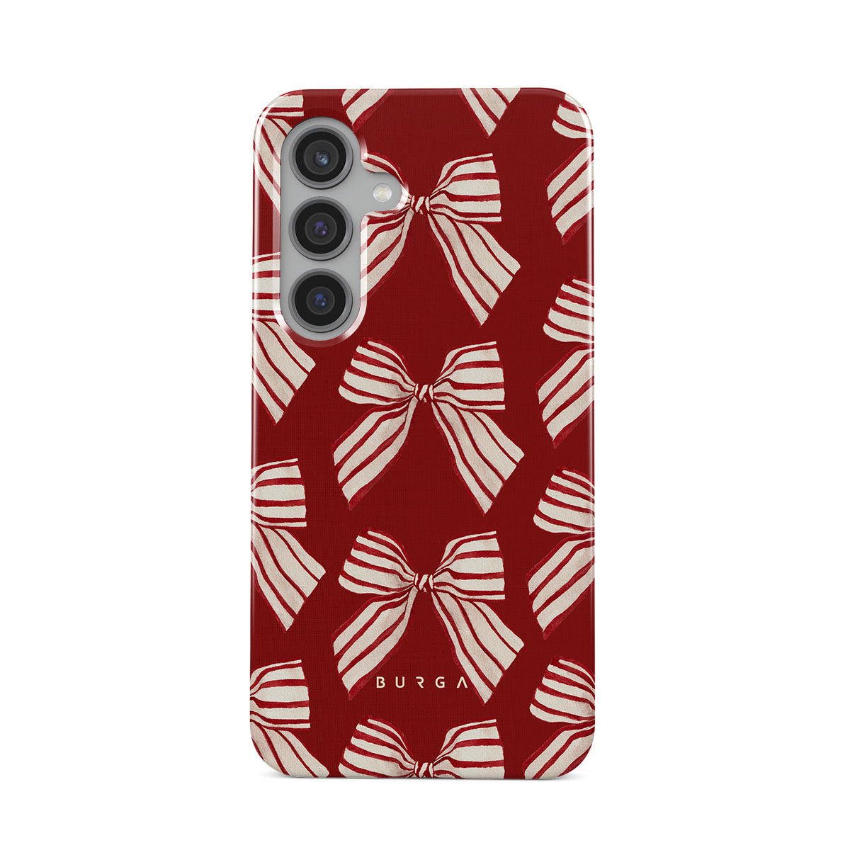 El diseño presenta: lazos, rayas, rojo, blanco, motivos navideños