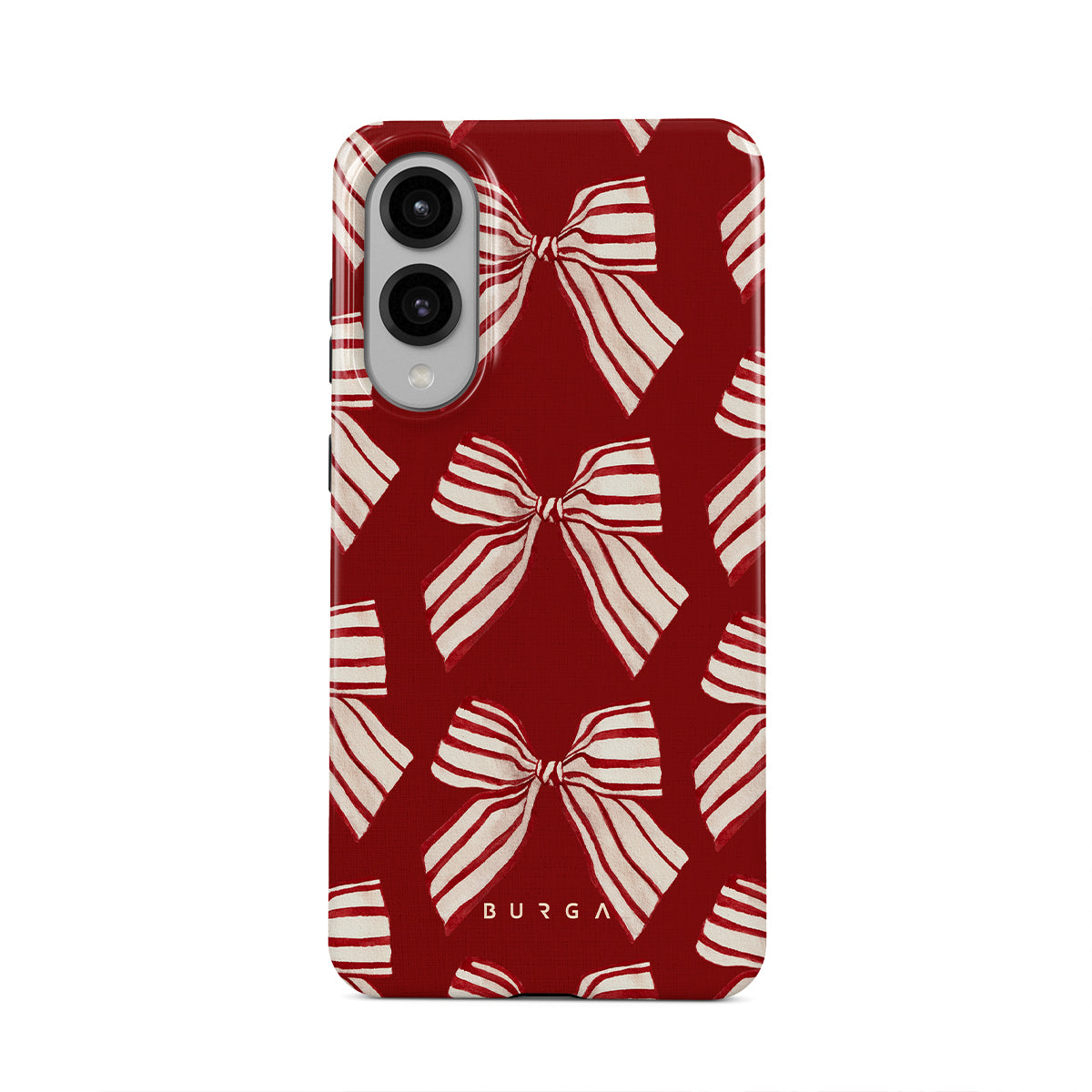 El diseño presenta: lazos, rayas, rojo, blanco, motivos navideños