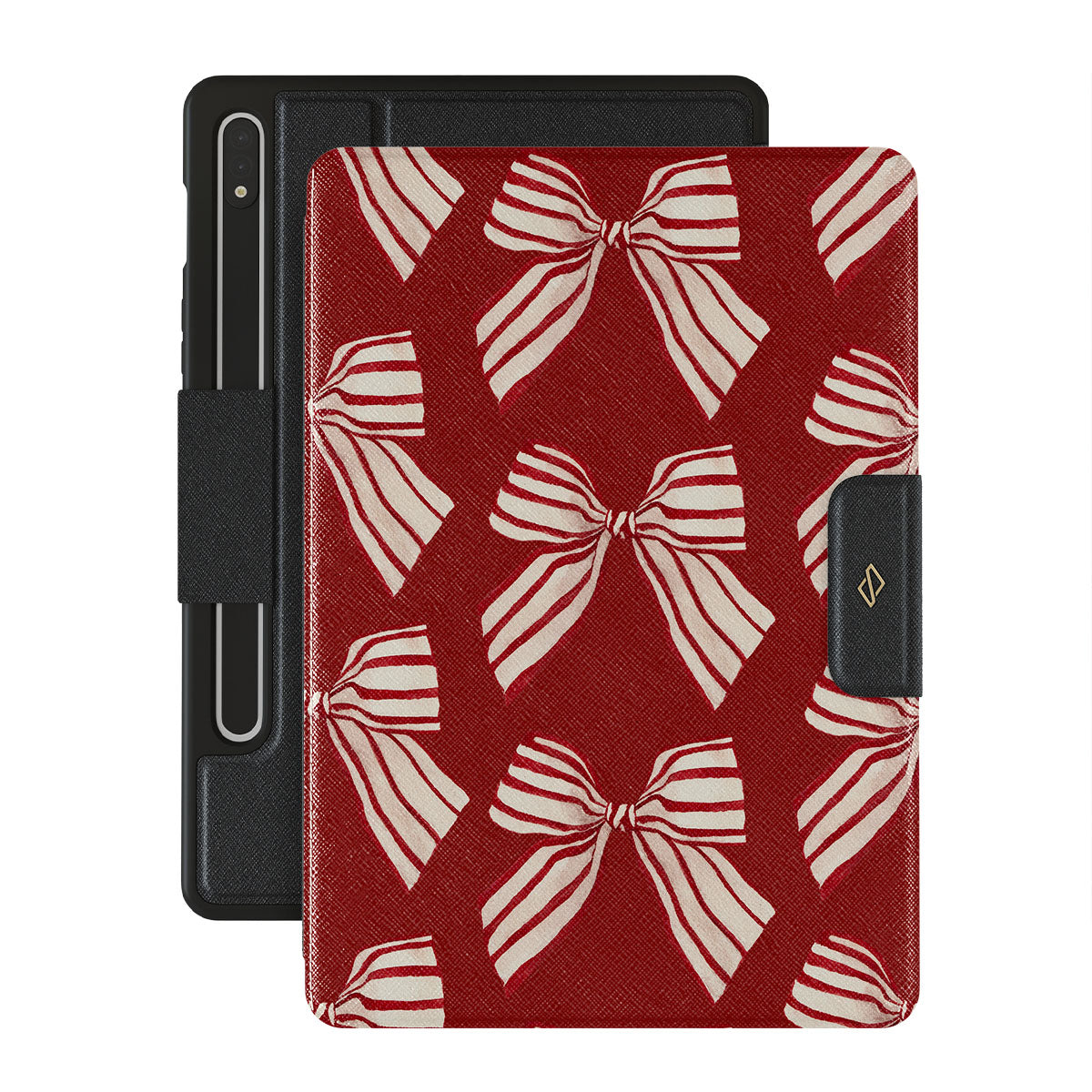 El diseño presenta: lazos, rayas, rojo, blanco, motivos navideños
