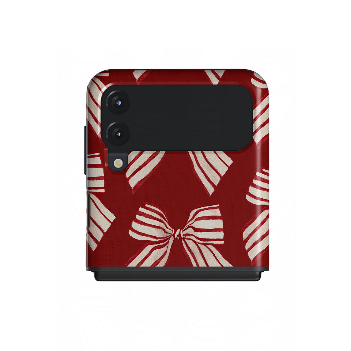 El diseño presenta: lazos, rayas, rojo, blanco, motivos navideños