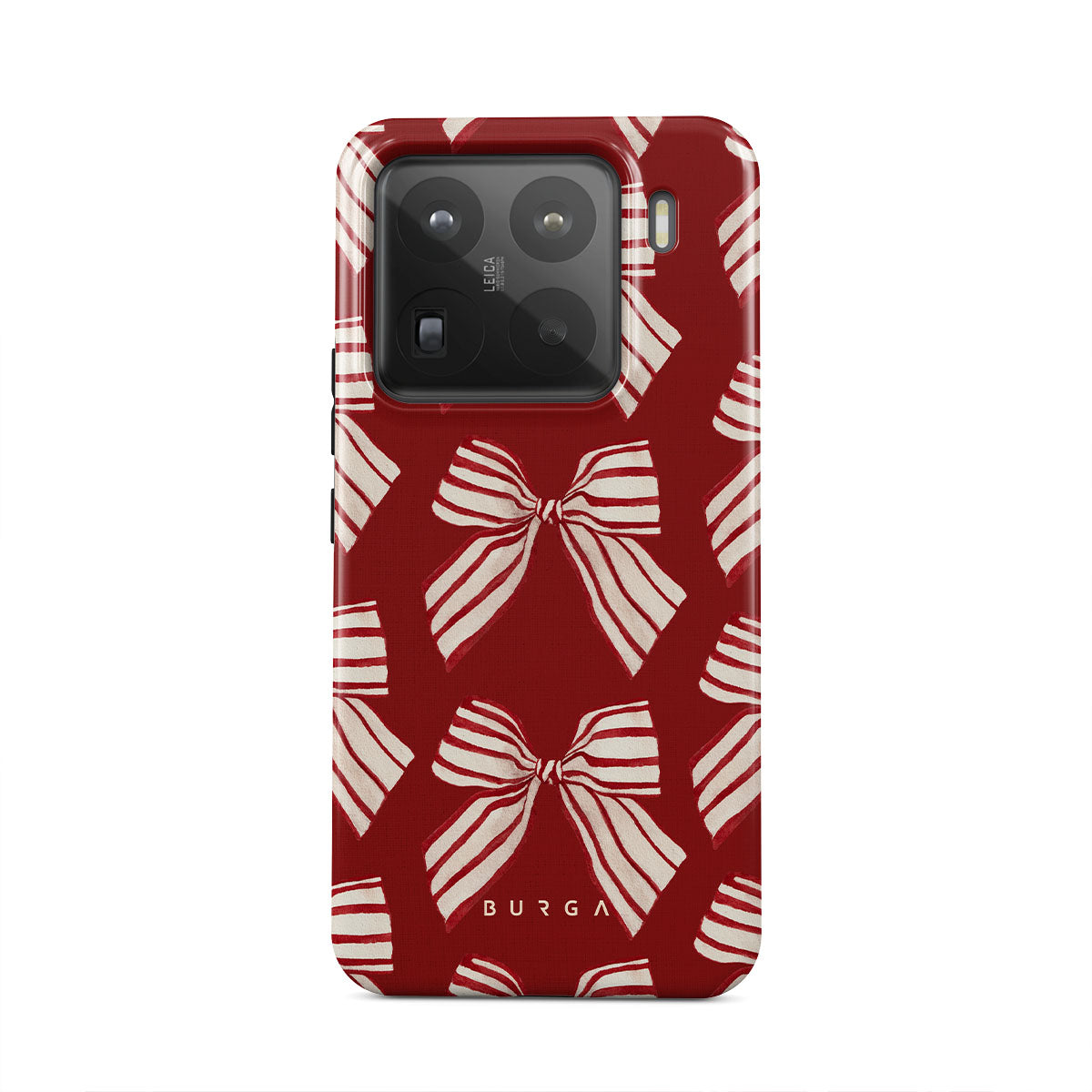 El diseño presenta: lazos, rayas, rojo, blanco, motivos navideños