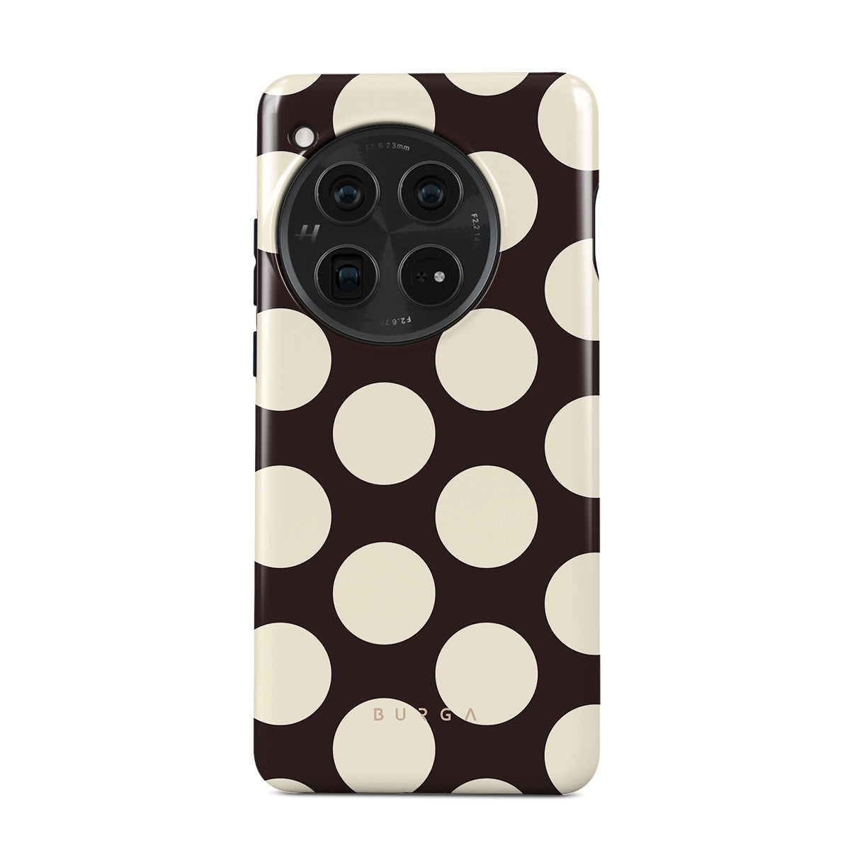 En este diseño: grandes lunares color crema, fondo oscuro