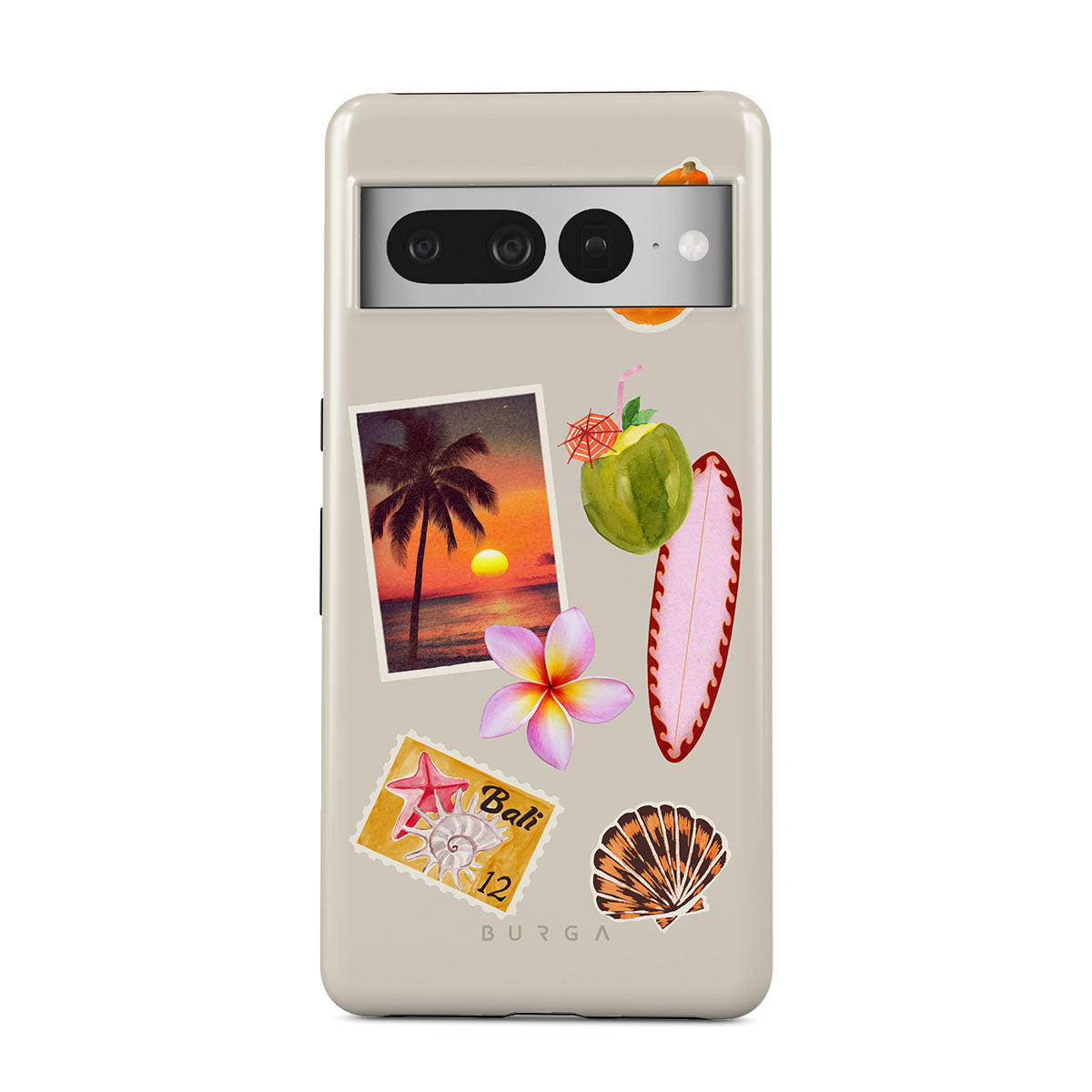 En este diseño: foto de atardecer tropical, papaya, coco verde, tabla de surf rosa, flor de plumeria rosa, concha naranja, postal de Bali.