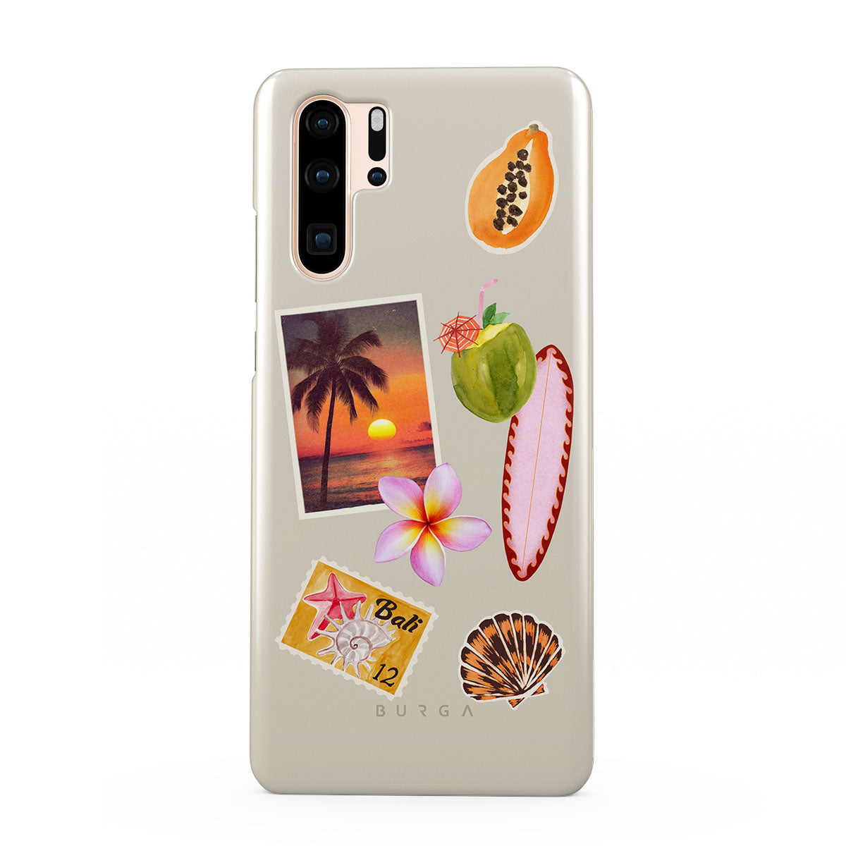 En este diseño: foto de atardecer tropical, papaya, coco verde, tabla de surf rosa, flor de plumeria rosa, concha naranja, postal de Bali.