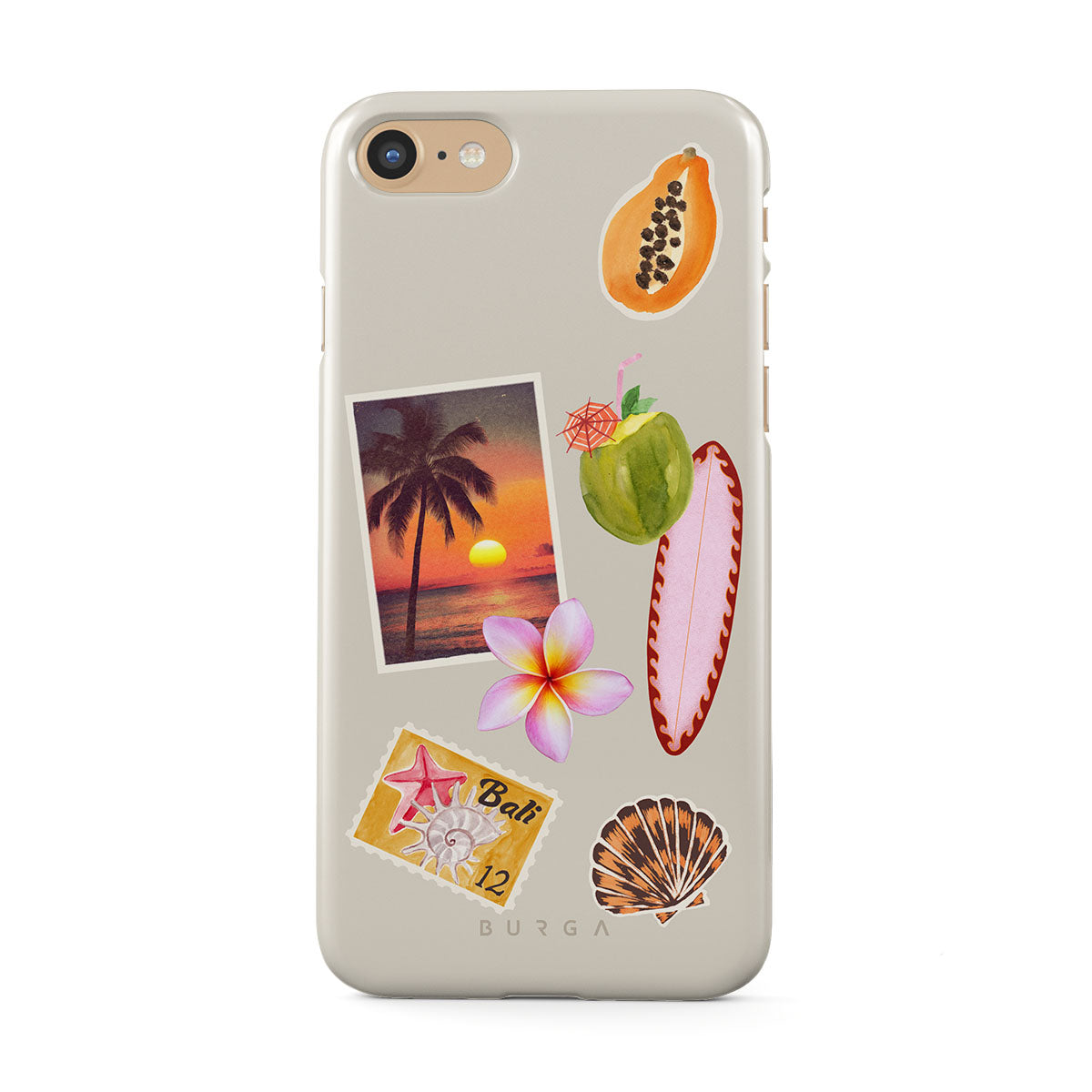 En este diseño: foto de atardecer tropical, papaya, coco verde, tabla de surf rosa, flor de plumeria rosa, concha naranja, postal de Bali.
