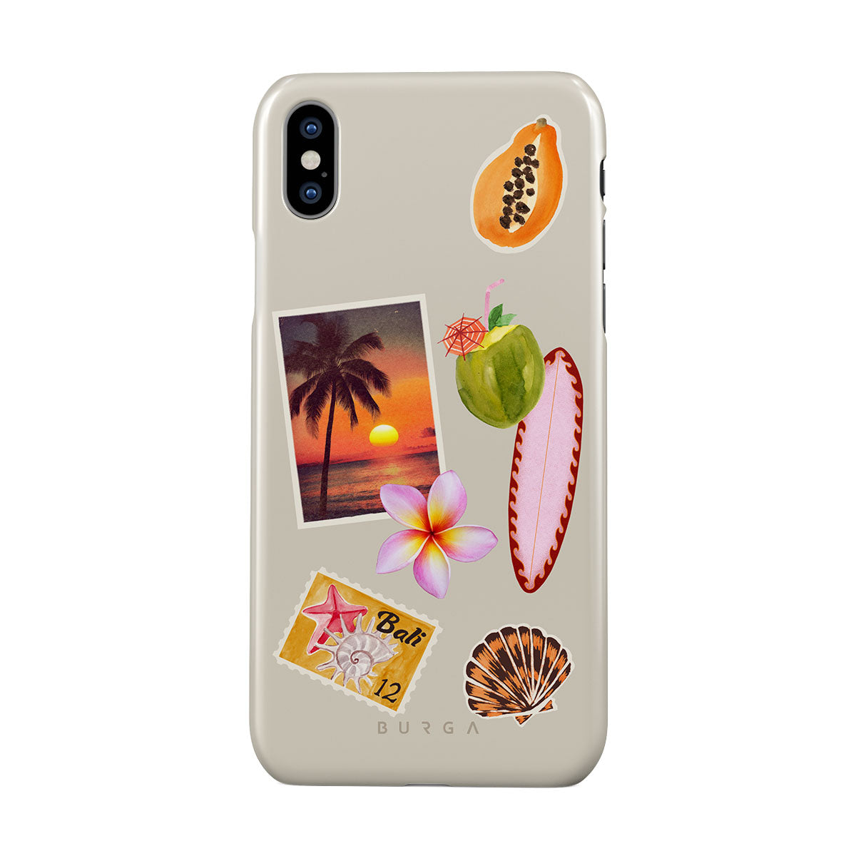 En este diseño: foto de atardecer tropical, papaya, coco verde, tabla de surf rosa, flor de plumeria rosa, concha naranja, postal de Bali.