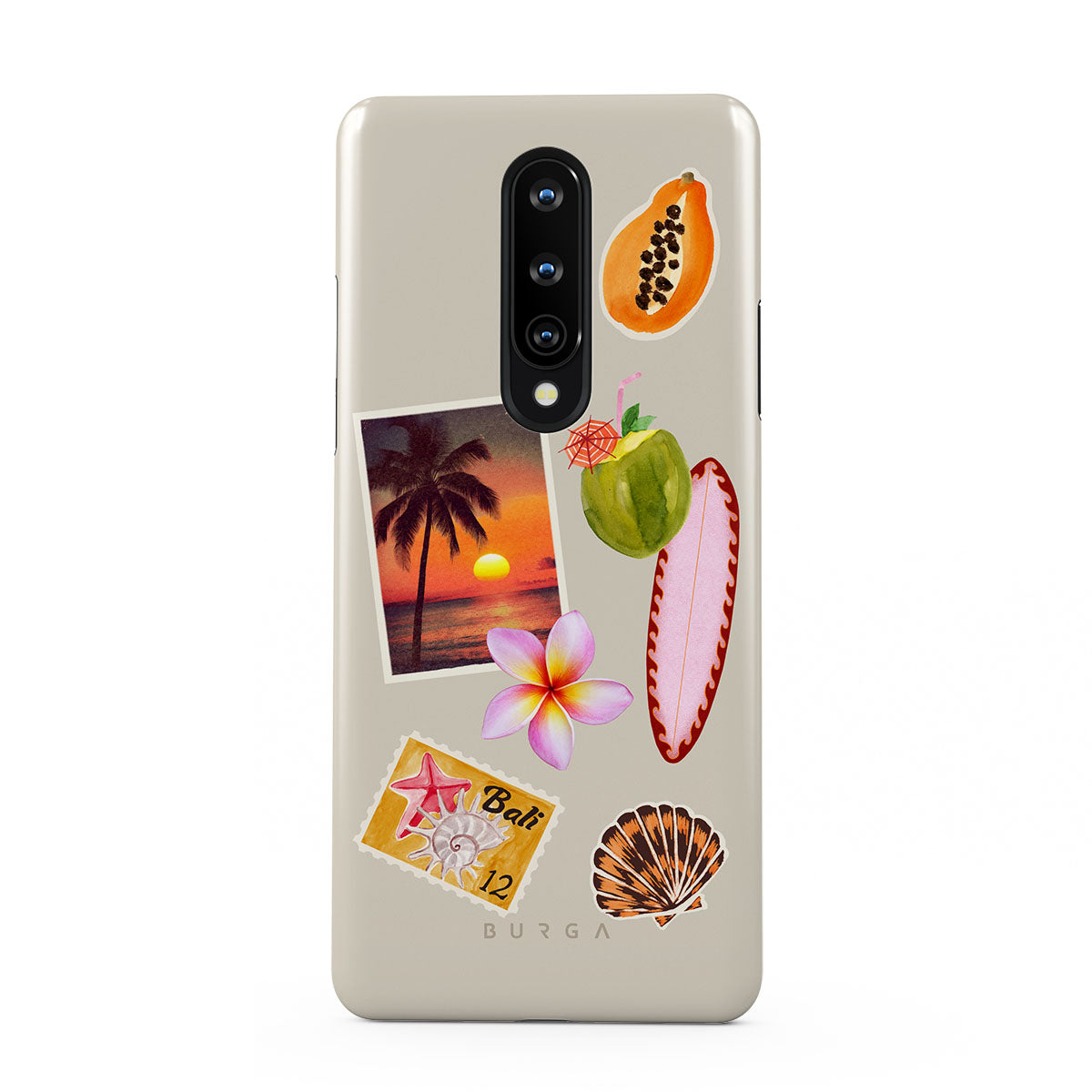 En este diseño: foto de atardecer tropical, papaya, coco verde, tabla de surf rosa, flor de plumeria rosa, concha naranja, postal de Bali.