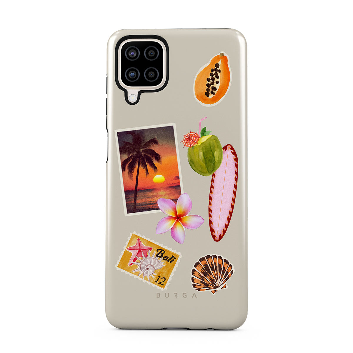 En este diseño: foto de atardecer tropical, papaya, coco verde, tabla de surf rosa, flor de plumeria rosa, concha naranja, postal de Bali.