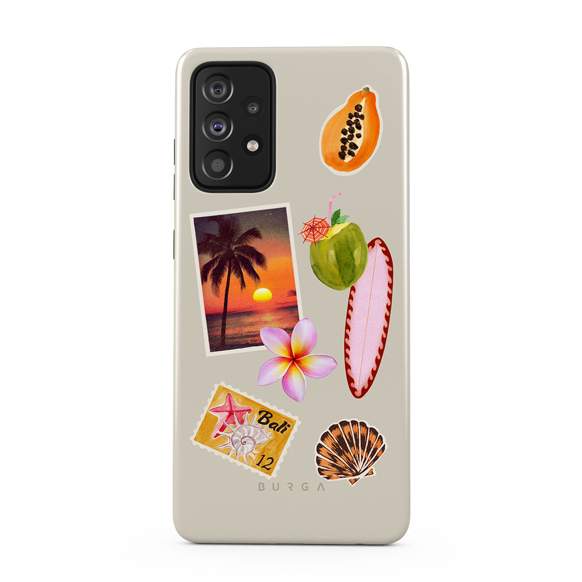 En este diseño: foto de atardecer tropical, papaya, coco verde, tabla de surf rosa, flor de plumeria rosa, concha naranja, postal de Bali.