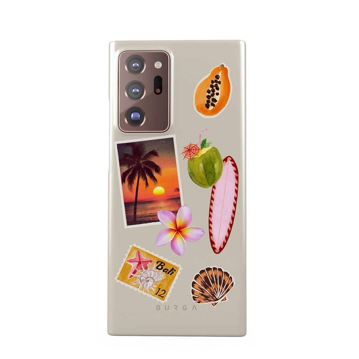 En este diseño: foto de atardecer tropical, papaya, coco verde, tabla de surf rosa, flor de plumeria rosa, concha naranja, postal de Bali.