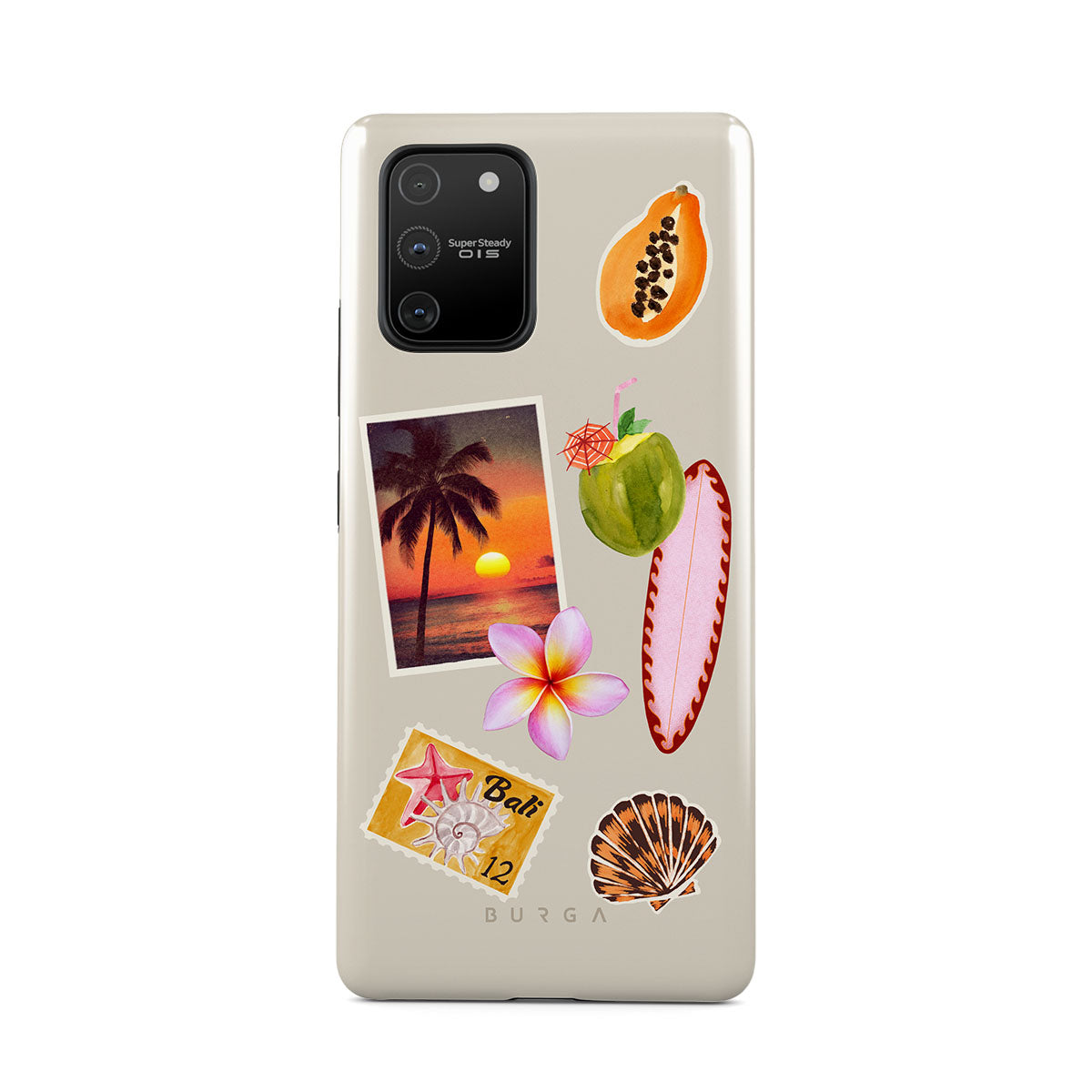 En este diseño: foto de atardecer tropical, papaya, coco verde, tabla de surf rosa, flor de plumeria rosa, concha naranja, postal de Bali.