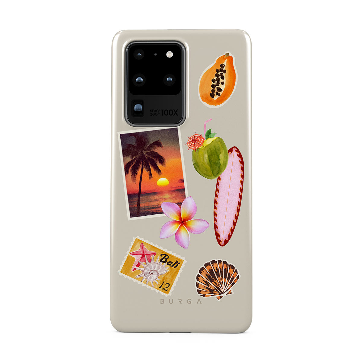 En este diseño: foto de atardecer tropical, papaya, coco verde, tabla de surf rosa, flor de plumeria rosa, concha naranja, postal de Bali.