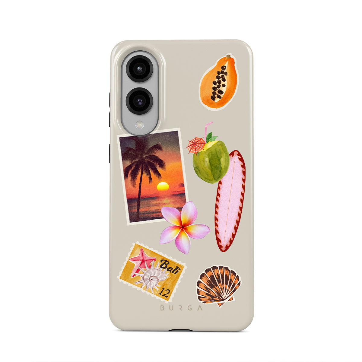 En este diseño: foto de atardecer tropical, papaya, coco verde, tabla de surf rosa, flor de plumeria rosa, concha naranja, postal de Bali.