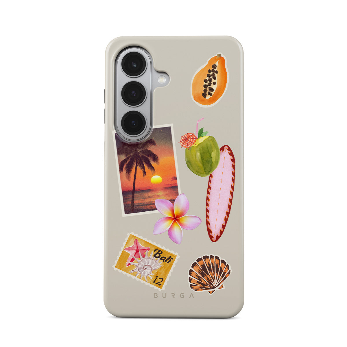 En este diseño: foto de atardecer tropical, papaya, coco verde, tabla de surf rosa, flor de plumeria rosa, concha naranja, postal de Bali.
